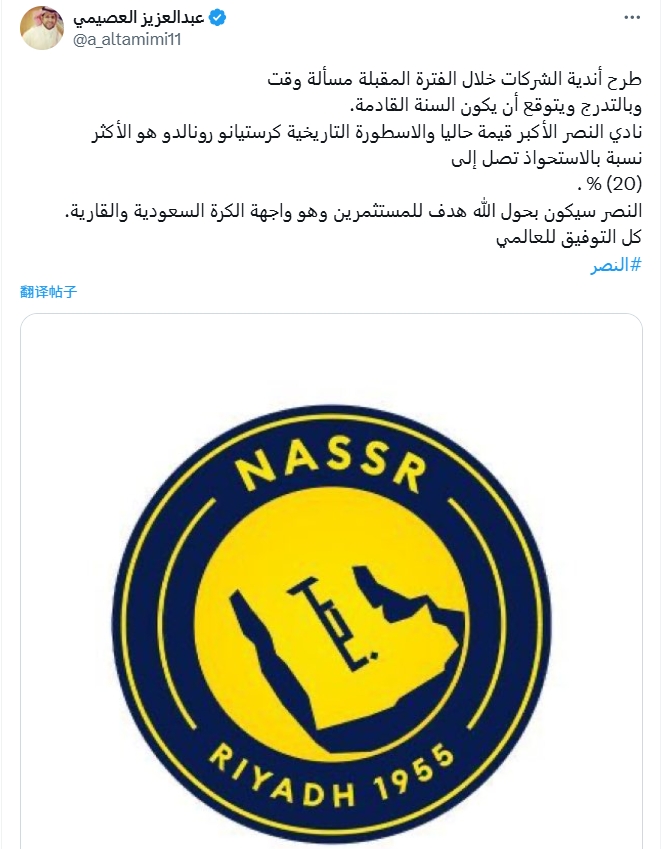 Riyadh Victory is currently the most valuable club, with Ronaldo currently holding the highest shareholding ratio reaching 20%. Riyadh Victory will become the focus of investors and become the facade of Saudi and Asian football.